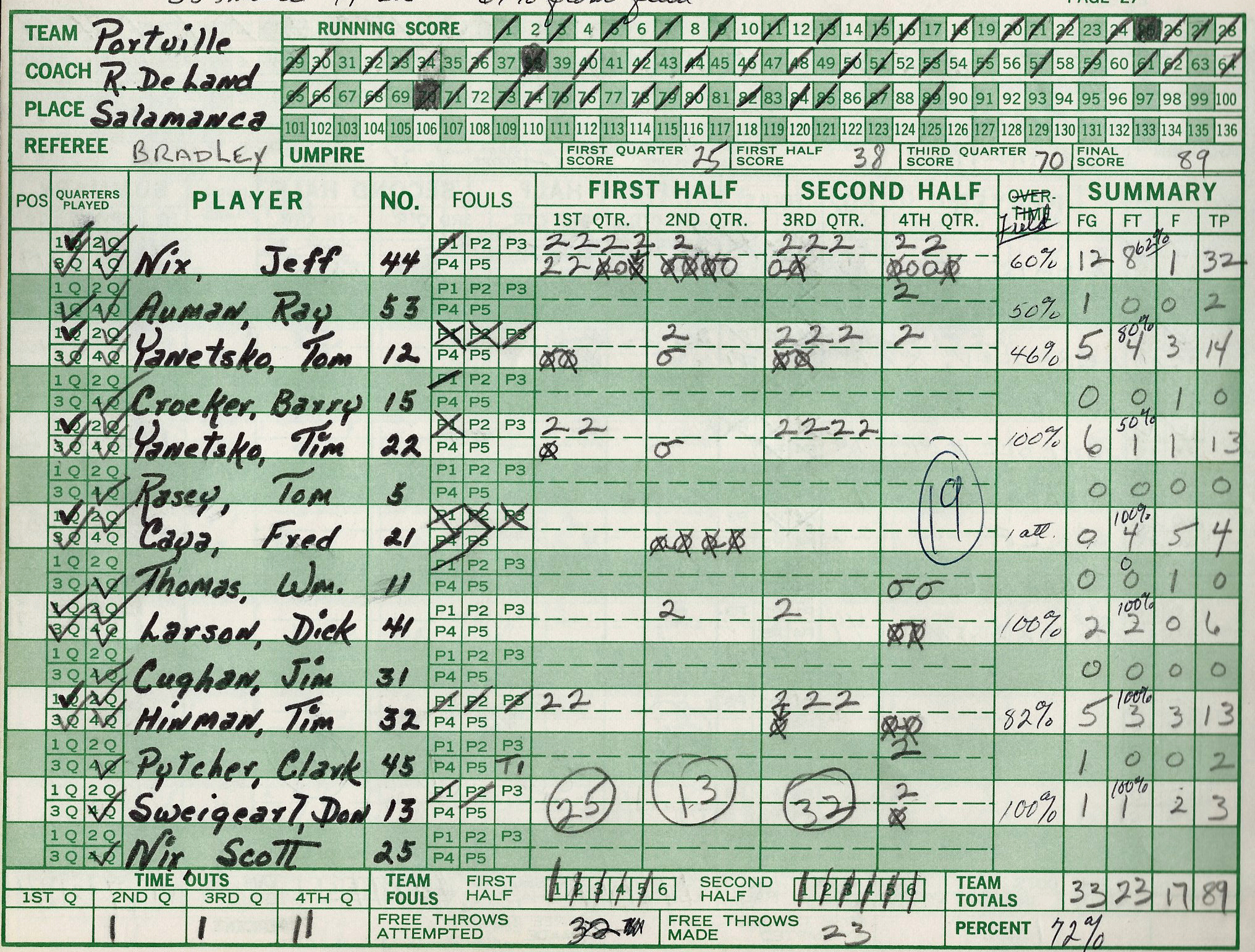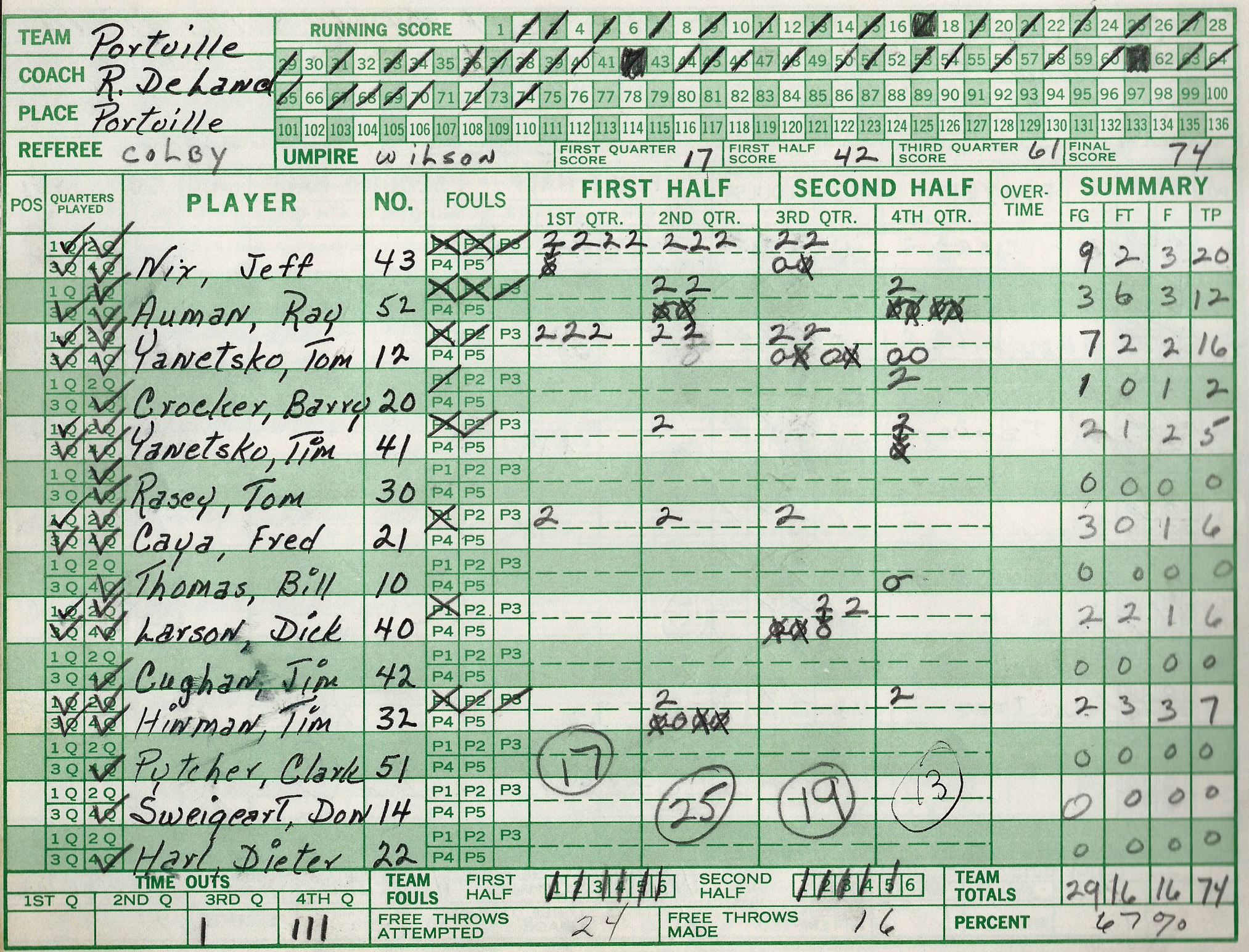 center Jeff Nix, who averaged 23.8 points a game. He scored a school record 46 points against Ellicottville, which still stands. He finished his 4-year varsity career with 942 points (#5 PCS all-time) in 65 games. Senior guard Tom Yanetsko averaged
